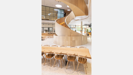 Auch die meisten Einbauten, zum Beispiel eine lange Theke in der Cafeteria oder das Mobiliar, bestehen aus Holz von Wäldern der Umgebung. Manche Details wie die kupfernen Regenfallrohre aus ineinandergreifenden Töpfen wird man erst auf den zweiten Blick entdecken.