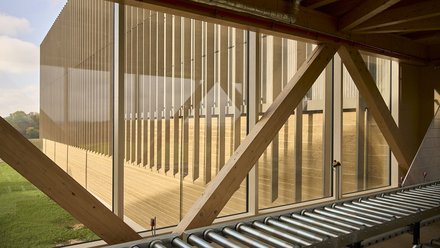An der Engstelle sind beide Gebäude durch eine verglaste Holzbrücke miteinander verbunden, auf der eine Paletten-Förderanlage für den zügigen Warentransport sorgt. Das Entree bildet schließlich der dritte Bau, ein kleineres zweistöckiges Verwaltungsgebäude, dessen unterer Part in eine Erdaufschüttung eingebettet ist und von einem begehbaren, mit Grün intensiv bepflanzten Dach gekrönt wird.