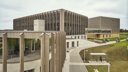 Den hohen Anspruch des neuen Centers unterstreicht auch die großzügige Dimensionierung des Grundstücks: Nur 20 Prozent der insgesamt 72.000 Quadratmeter sind überbaut. Dem Außengelände haben die Landschaftsarchitekten vom Büro Hink aus Schwaigern mithilfe des beim Bau der Gebäude angefallenen Aushubs eine wellige Oberflächenstruktur verliehen. Streuobstwiesen, frei wachsende Heckenanlagen, regionale Wacholdersträuche und dazu 35.000 neu angepflanzte Blumenzwiebeln sollen die vormalige Monokultur durch neue Biodiversität ersetzen und den Mitarbeitern als Aufenthaltsort dienen.