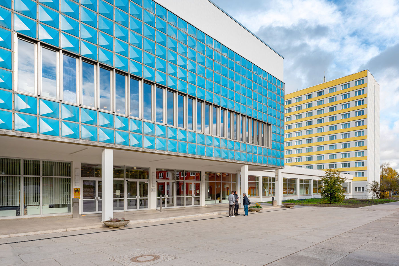 Wie in einem Museum hat man sich wohl auch in Erfurts ehemaliger SED-Parteischule gefühlt (Planung: Wohnungsbaukombinat Erfurt, Leitung Heinz Gebauer). Von der Tapete über die Leuchten bis zum Besteck in der Mensa waren große Teile der Einrichtung seit der Eröffnung 1972 erhalten – trotz diverser Zwischennutzungen als Fachhochschule, Wohnheim, Disco oder Zierfischbörse. Aber genau das ersparte dem Haus tiefgreifende Veränderungen, sodass 2008 der Denkmalschutz erfolgte.