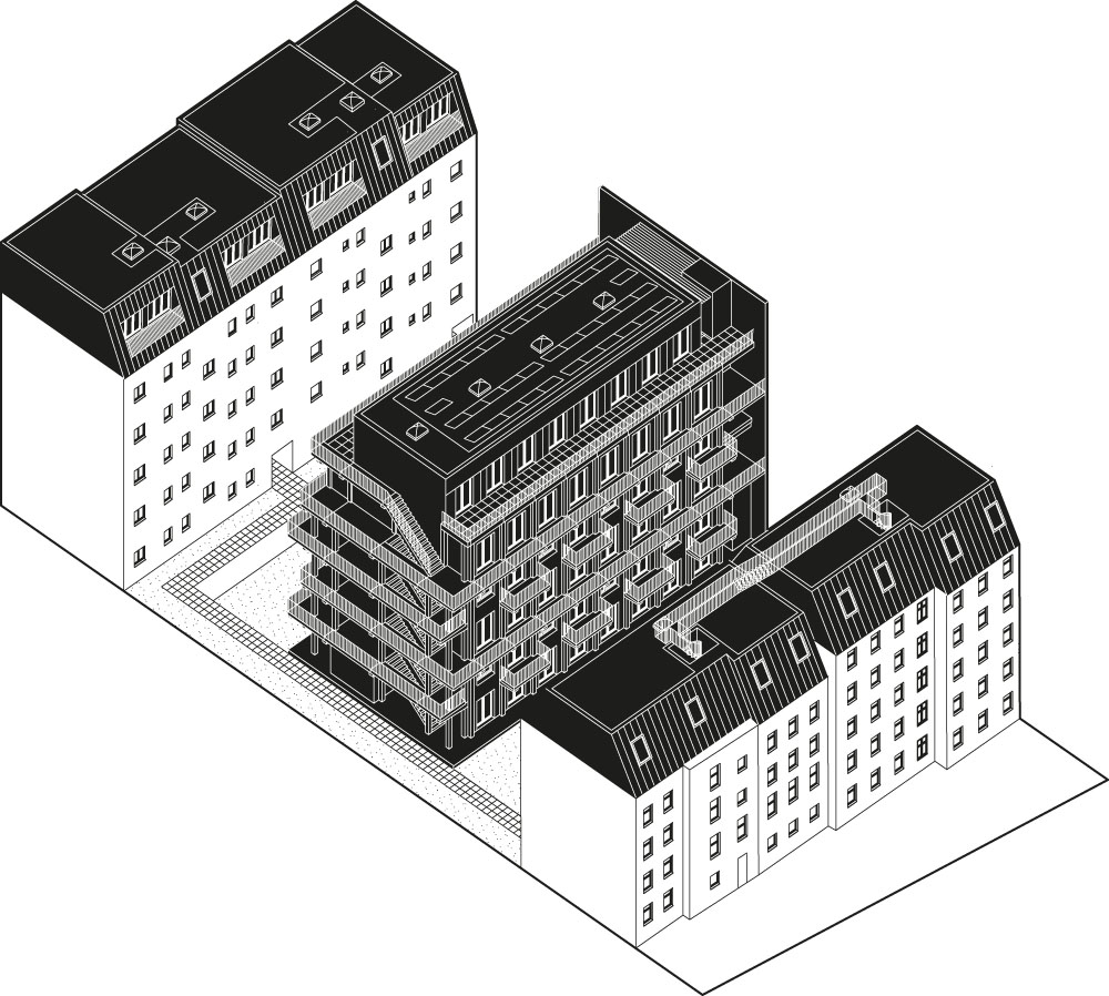 Aufgabe des Architekten war es, die größtmögliche Dichte aus dem Berliner Grundstück herauszuholen. Neben dem Neubau im Hof wurden drei Bestandsgebäude aufgestockt.