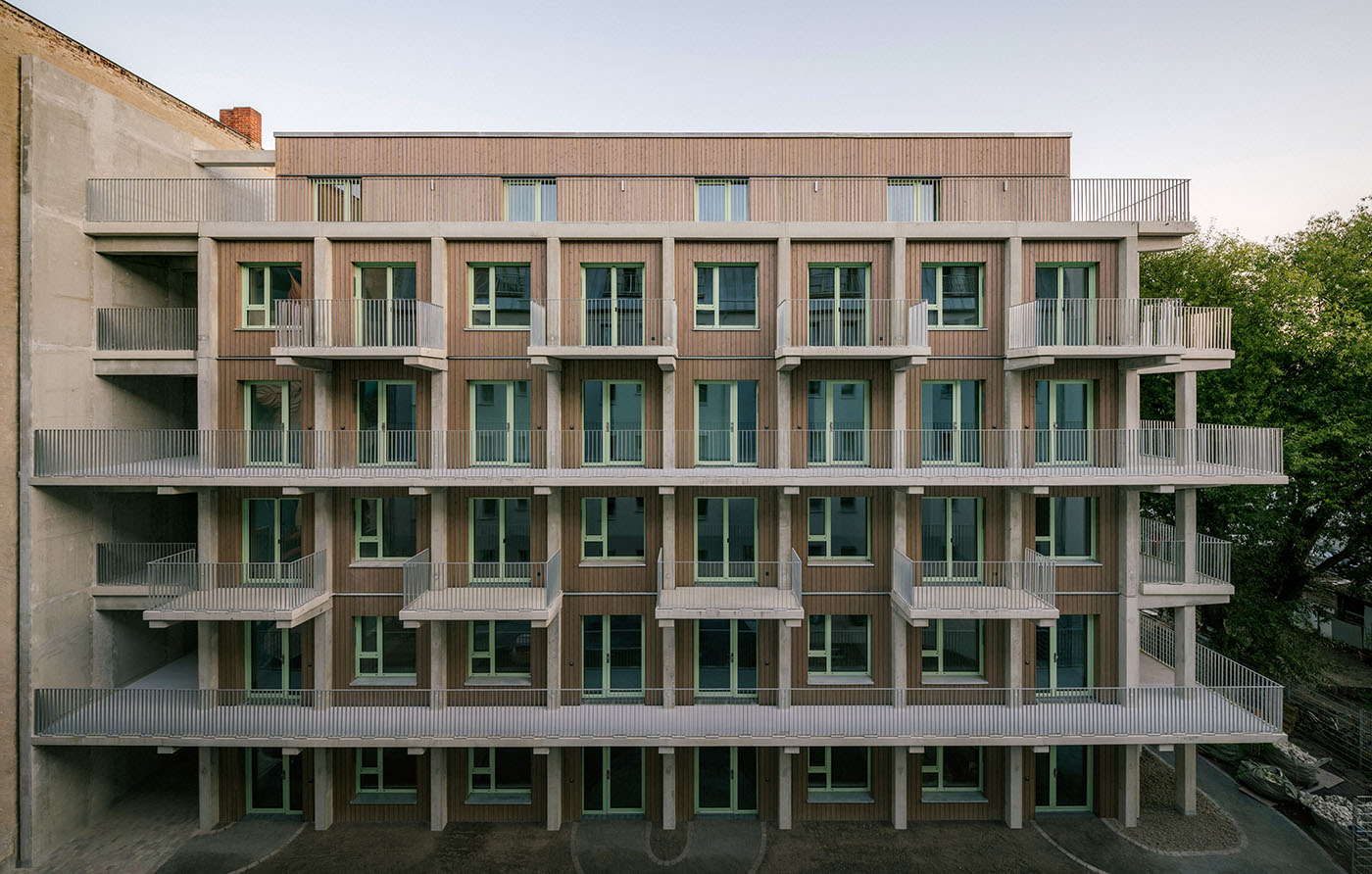 In Berlin wünschte sich der Bauherr einen Holzbau mit hohem Vorfertigungsgrad. Hinter dem Exoskelett aus Beton umfasst der Holzkorpus 20 Wohnungen.