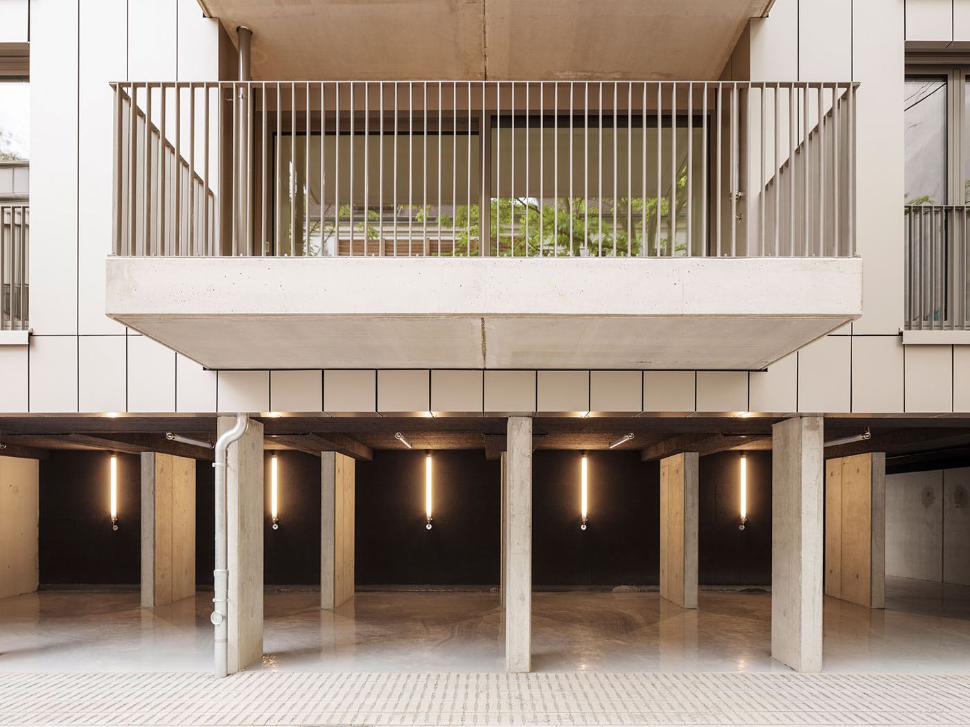 „Das Dach der Tiefgarage wurde statisch stärker ausgebildet als notwendig und während der Bauphase mit einem wahren Stützenwald abgesichert, da es zum Trägerziehen und Verfüllen der Baugrube anschließend mit schwerem Gerät befahren werden musste“, erläutert Architektin Margarethe Mink.
