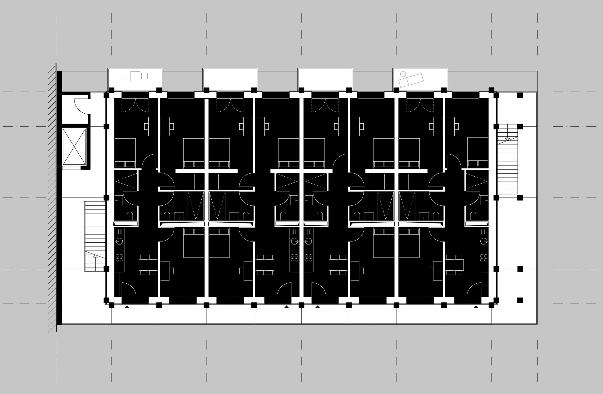 Erschlossen wird der Neubau nun durch die Durchfahrt im Vorderhaus. Das Erdgeschoss ist als reines Erschließungsgeschoss ausgebildet. Hier befinden sich neben einem Haustechnikraum die notwendigen Stellplätze sowie ein innen liegendes Treppenhaus und ein Fahrstuhl.