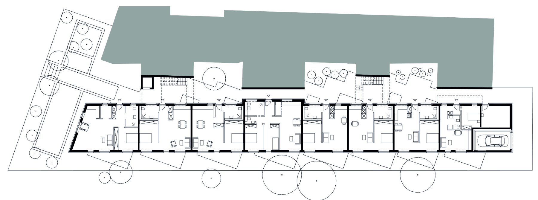 Hinter dem schmalen Kopfbau verbirgt sich ein langer Riegel mit 29 Mietwohnungen, die ...