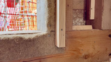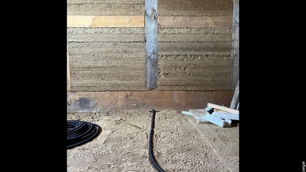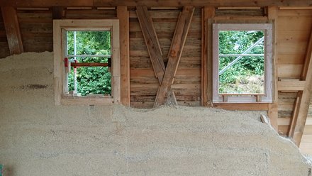 Die Materialbeschaffung mag in jenen fernen Zeiten aber ähnlich gewesen sein wie heute: Für eine GEG-konforme Dämmung der Wände sorgt eine Mischung aus Kalk und Hanf, mit einer Gleitschalung händisch eingebracht. Sie erreicht einen beachtlichen U-Wert von etwa 0,2. Zum Einsatz kamen nur Hanfschäben, also die Stängel, die der Landwirt sonst unterpflügt. Ein Lehmputz bildet die abschließende Schicht.