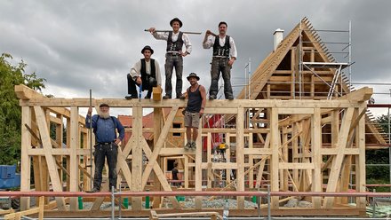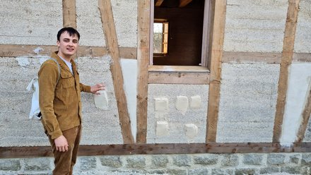 Ein Team aus Handwerkern und einem jungen Planer baut mit Holz-Fachwerk, Stampfkalk, Hanffasern und vielem mehr.