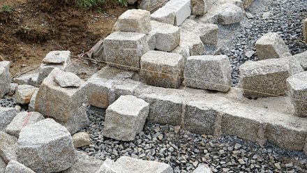 Das Holz für die Neubauten kam aus dem nahen Wald, die Steine für den Sockel aus einem lokalen Steinbruch. Die Streifenfundamente bestehen aus Stampfkalk (römischer Beton „wie beim Pantheon“, weiß Julius Schönberger). Wie das Einstampfen der Kalk-Lehmmischung wurde vieles von Hand beziehungsweise Fuß erledigt – doch anders als im Geschichtspark, wo es um gelebte Archäologie geht, waren heutige, elektrisch betriebene Werkzeuge erlaubt.
