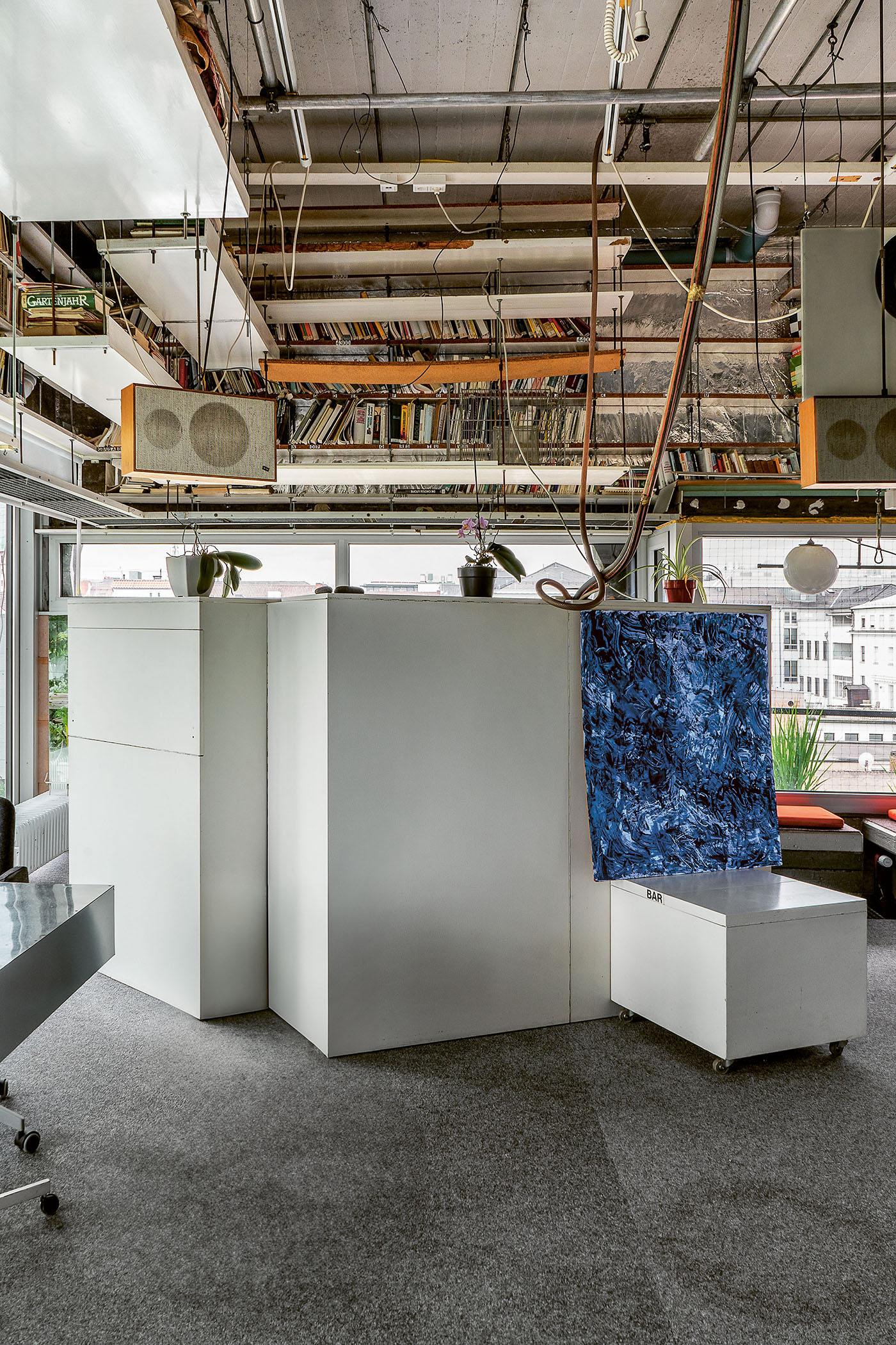 Das einem radikalen Lowtech-Ansatz folgende „Gestell“ eines fast ungedämmten passivsolaren Hauses beherbergt im oberen Bereich die originell wandelbare Wohnung von Ot Hoffmann, für die er seinerzeit konsequent sein Haus am Stadtrand aufgab. Als genügsamer „Stadtrobinson“ heizte er offenbar fast nie. Heute wird der Bau von Hoffmanns Söhnen Pan und Till betreut.