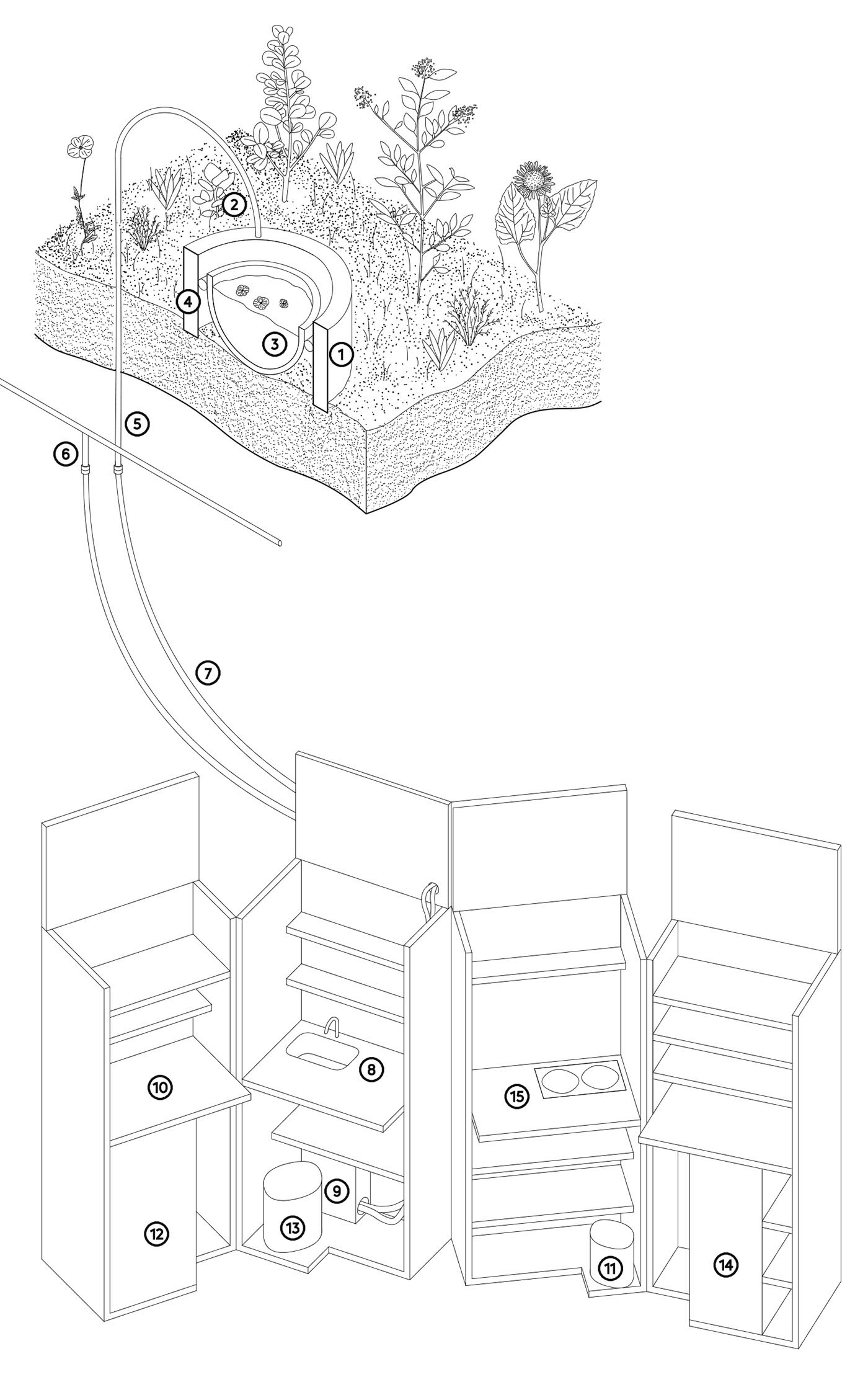 Faltbares Küchenmöbel mit Grauwasseraufbereitung: 1 Brunnen, 2 Überlauf für Grauwasser, 3 Pflanzen als Qualitätsprüfer, 4 Filterring, 5 Abwasserschlauch für Grauwasser, 6 Zuwasseranschluss für Frischwasser, 7 flexible Schläuche, 8 Spülbecken, 9 Grauwasserbehälter mit Pumpe, 10 Arbeitsflächen, 11 kompostierbare Abfälle, 12 Kühlschrank, 13 Restmüll, 14 Geschirrspüler, 15 Kochplatten