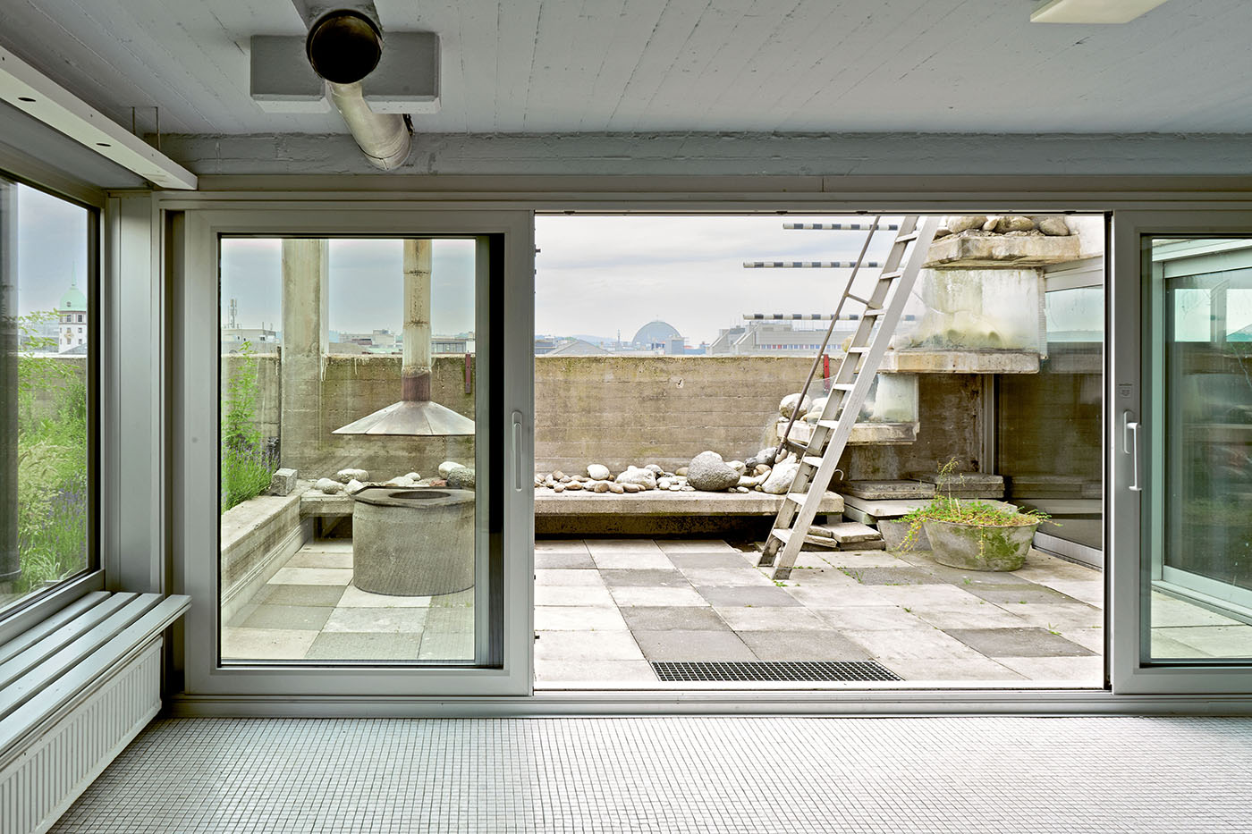 Zusätzlich ist der große, offene Dachraum nach Süden hin verglast, also ein Wintergarten. Otto Steidle wollte hier ursprünglich die durch den Neubau vertriebenen Schrebergärtner ansiedeln, was sich im Laufe der Planung zerschlug.
