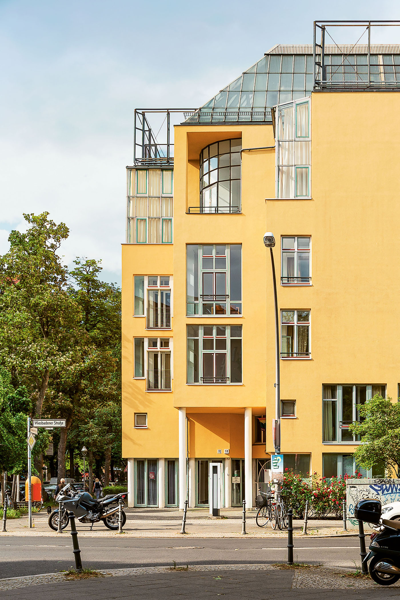 Dass inzwischen der städtische Kontext weit wichtiger geworden war, zeigt die maßstäbliche Einfügung in das gründerzeitliche Quartier um den Rüdesheimer Platz: Der Neubau (Bau 1979–1983) mit immerhin 78 Wohnungen sowie Gemeinschaftsflächen schließt den Blockrand und passt sich in Dachform wie Körnung seinem Umfeld an – das ist sozusagen die weiche Seite der Ökologie.