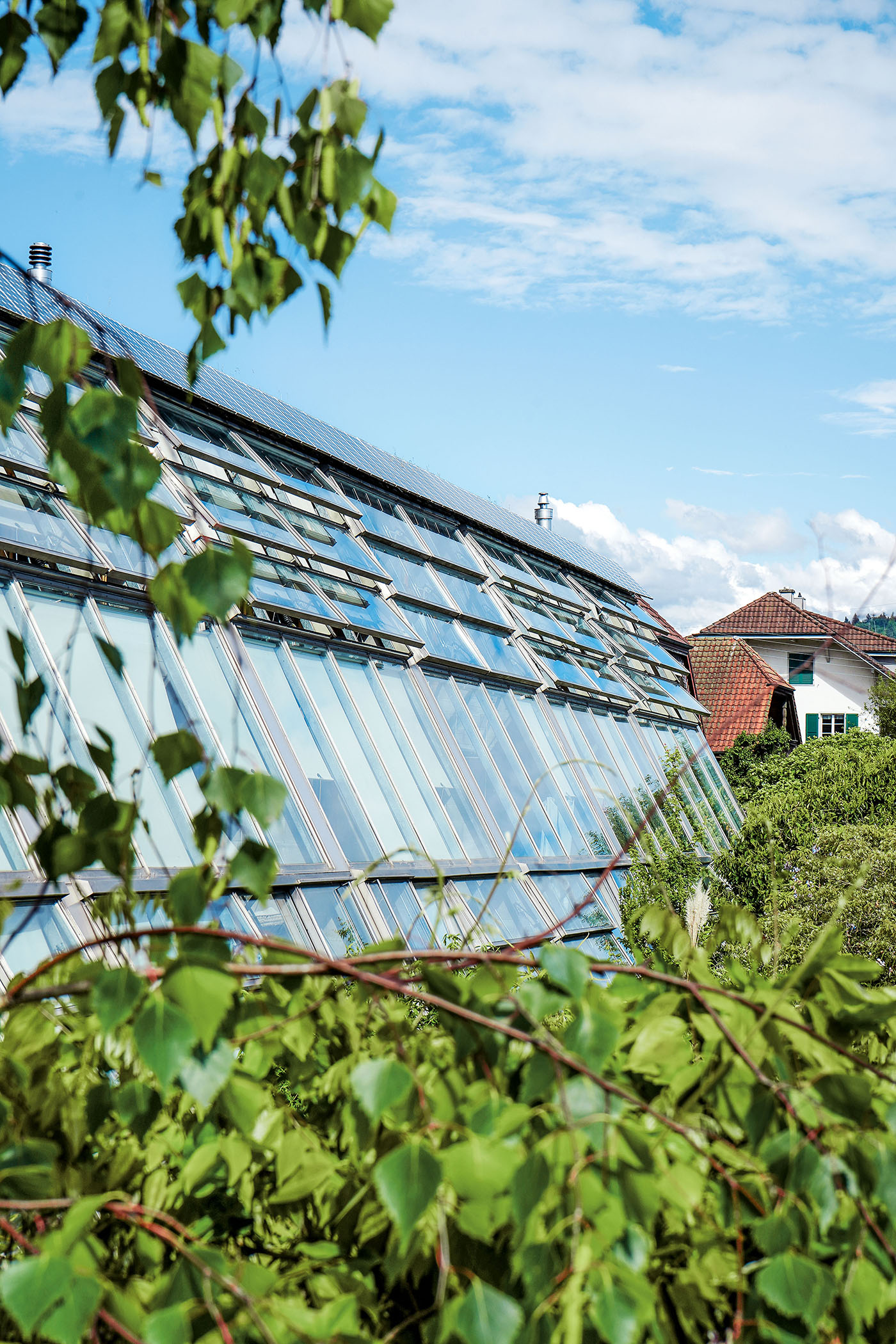 Ein solches Schicksal blieb dem Mitte der 1990er-Jahre errichteten „Solarhaus“ in Zollikofen erspart. Der junge Schweizer Architekt Rolf Schoch, heute Anfang 80, realisierte die passivsolare Reihenhausanlage, wohl von amerikanischen Vorbildern inspiriert, für eine Genossenschaft aus acht Parteien im Kanton Bern. An einem Südhang gelegen, funktioniert das 50 Meter lange Haus wie ein großer Sonnenkollektor: Während der Großteil des dreistöckigen Volumens in den Hang eingegraben wurde, öffnet sich die Talseite vollverglast gen Süden.