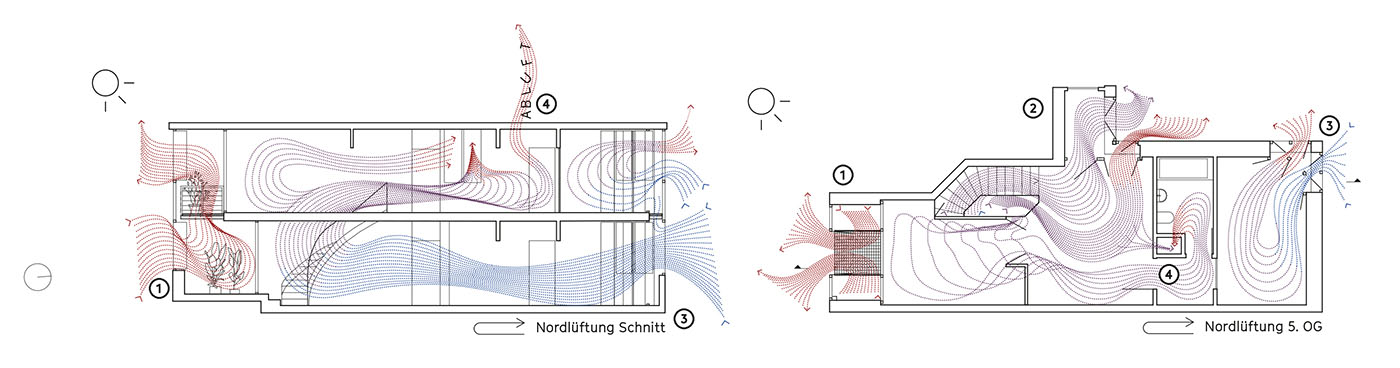Das Lüftungskonzept des IBZ nutzt die Temperaturunterschiede zwischen Nord- und Südseite. Hier der Lüftungsfall Sommer im Normal- und im fünften Obergeschoss.