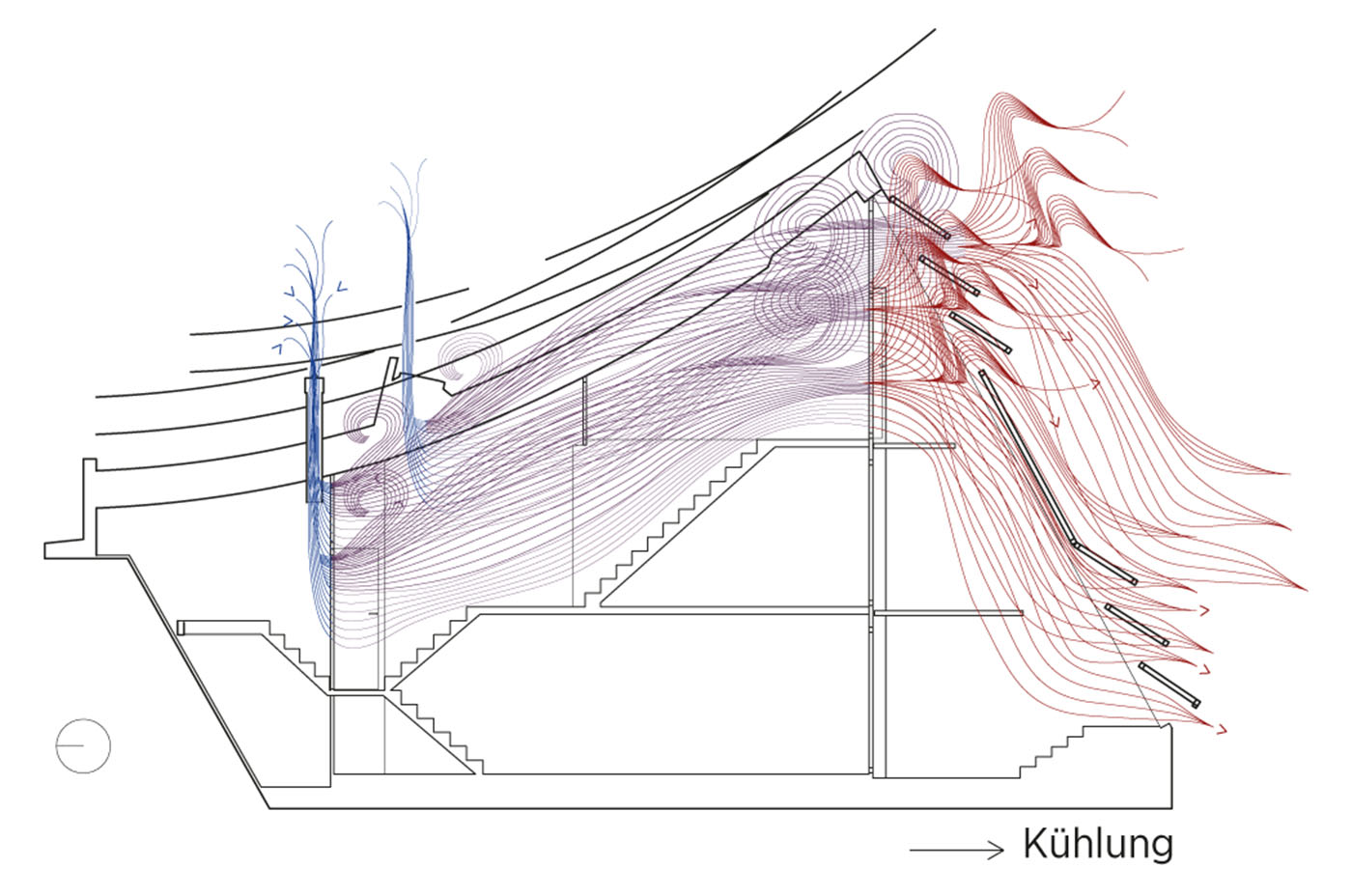 Doch auch das Energiekonzept, mitentwickelt von Vladimir Nikolic, ist integraler Bestandteil des Entwurfs. Es setzt auf die natürliche Luftzirkulation zwischen der kühlen Nord- und der warmen Südfassade. Beidseits dienen Pufferräume der Steuerung der Luftströme, um im Sommer Kühle und im Winter Wärme ins Haus zu bringen.