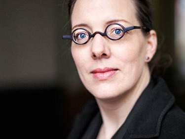 Person mit lockigem Haar hält ein großes Blatt mit technischen Zeichnungen oder Plänen vor sich.