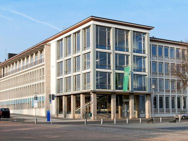 Blick über eine große, gepflasterte Fläche auf ein modernes Gebäude mit schrägen Stützen und Glasfassade, im Hintergrund Stadtgebäude und Bäume.