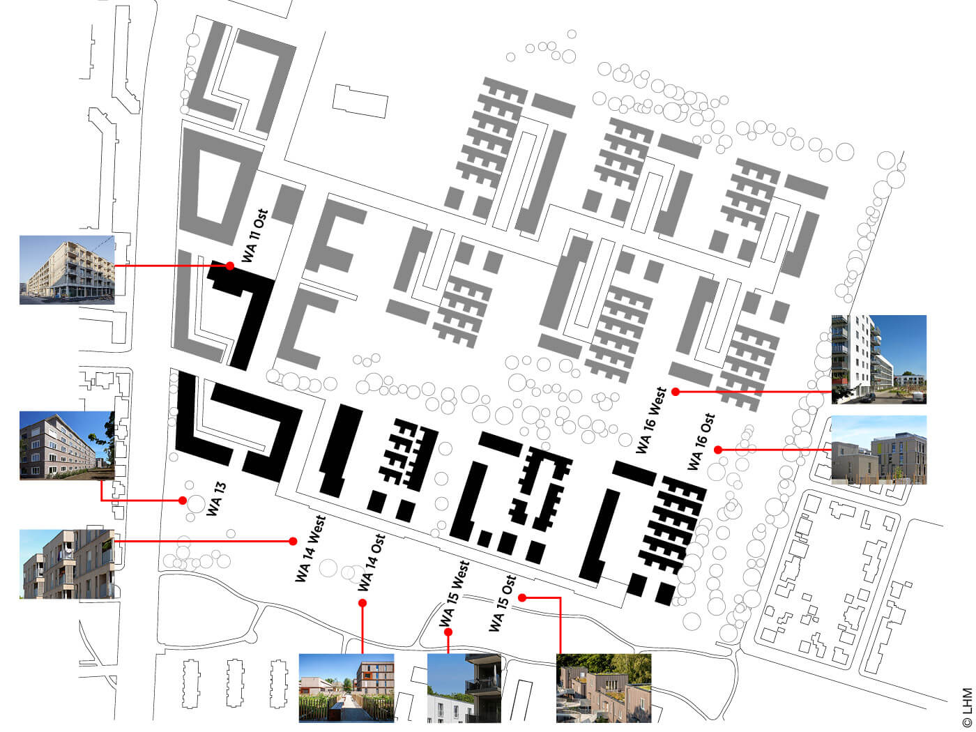 - WA 11 Ost: 82 Mietwohnungen einer Genossenschaft inkl. geförderten Wohnungen: Atelier 5, Bern (LP 1–4), a+p Architekten, München (LP 5–8)