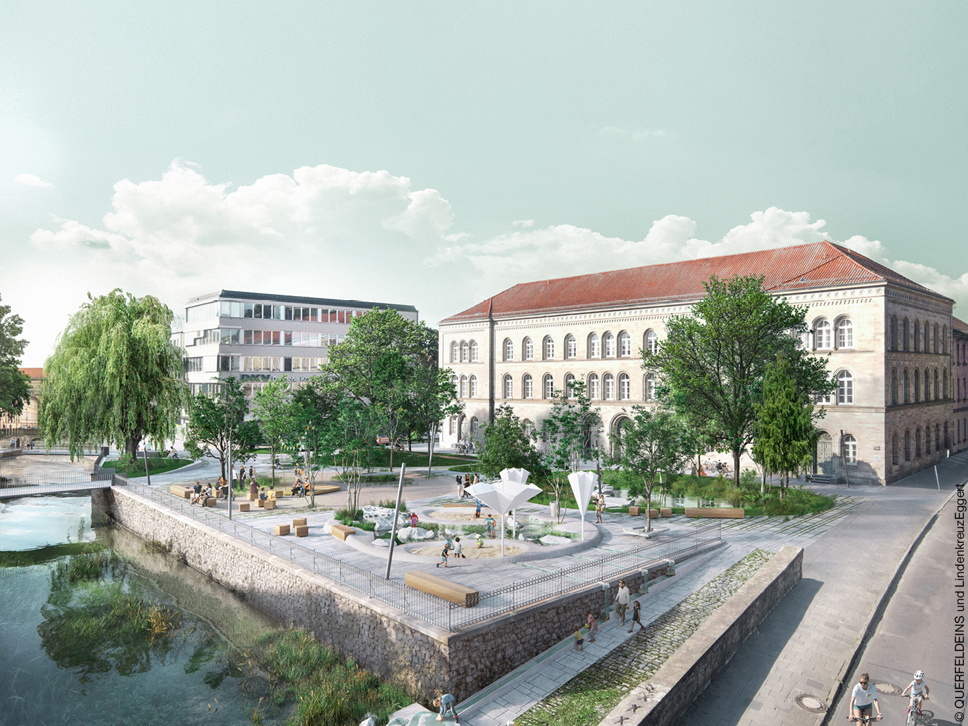 Auch die Umgestaltung des Parks mit Raumtypologien wie der „blaugrünen Landschaft“ und einer „blühenden Landschaft“ mit Stauden und Wildblumen sorgten für den Wettbewerbssieg. Da das Projekt durch das Bundesprogramm „Anpassung urbaner Räume an den Klimawandel“ gefördert wird, waren gerade nachhaltige Entwurfsbausteine wie die blaugrüne Infrastruktur – also die aktive Nutzung des Regenwassers – ein wichtiger Bestandteil.