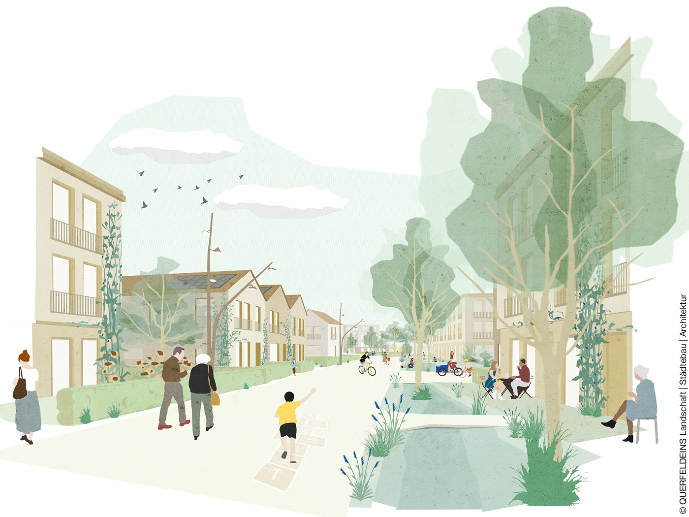 Wohnen mit Wasser: Für das Neubaugebiet Lange Rekesweg in Göttingen hat Querfeldeins 2023 den 1. Preis im Wettbewerb gewonnen. (Klicken für mehr Bilder)
