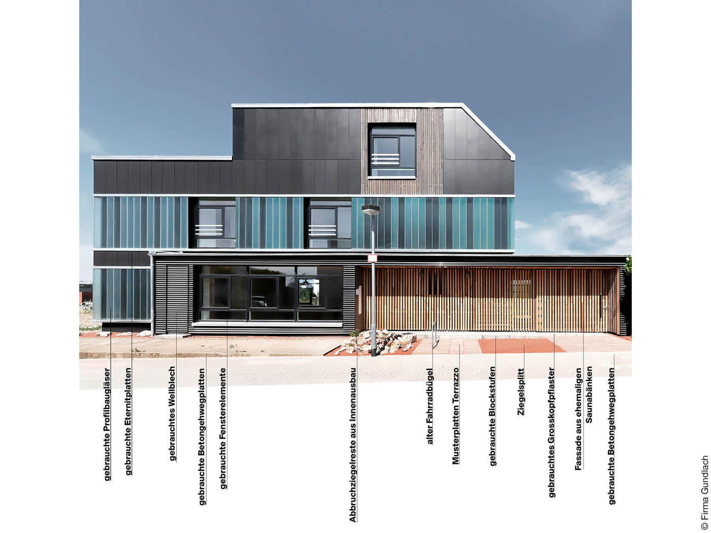 Ein Vorteil des Hannoveraner Projektes zeigt sich beispielhaft bei der Fassade. Deren Elemente stammen von Gebäuden der Bauherrin Gundlach, die abgerissen oder umgebaut wurden – etwa dem ehemaligen Hannoveraner „Haus der Jugend“, das zum Wohnhaus umgebaut wurde. Seine in blaugrünen Tönen schillernden Profilbaugläser wurden demontiert und gereinigt, ebenso die Faserzementplatten aus dem Jahr 2007, die neu zugeschnitten und in schwarz beschichtet wurden. Die im wettergeschützten Eingangsbereich angebrachten Holzleisten, die einen angenehmen Kontrast zum kühl wirkenden Glas bilden, stammen aus den Saunen eines nahen Sportclubs, wo sie als Sitzbänke dienten.