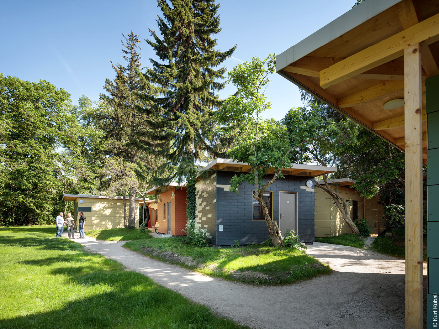 Insgesamt 24 Männer dürfen hier selbstbestimmt leben und erhalten auf Wunsch Unterstützung durch Freiwillige und Sozialarbeiter. „Es geht ja für die Bewohner vor allem darum, einen Platz zu finden, wo sie einfach sein dürfen“, sagt Hagner. Die Hütten sind mit unterschiedlichen Eternit-Fassadenplatten verkleidet und jeweils anders ausgerichtet, sodass jeder Bewohner viel Privatsphäre und einen individuellen Außenraumbezug erhält. Zugleich bieten der Garten und ein Gemeinschaftsraum die Möglichkeit, an einem sozialen Leben teilzuhaben.