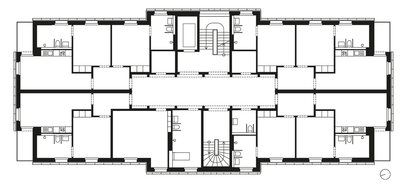 Die Architektin Antje Freiesleben erklärt: „Die Menschen, die hier leben, haben ein großes Bedürfnis nach Autonomie und Privatsphäre. Daher sind die kleinschrittigen Übergänge vom Gemeinschaftlichen ins Private entscheidend“ – von den Sozialräumen für Tagesgäste im Erdgeschoss über die Flurgemeinschaften in den Obergeschossen, von dort in die meist zu zweit genutzten Wohnungsflure und Wohnküchen bis ins eigene Schlafzimmer mit privatem Bad.