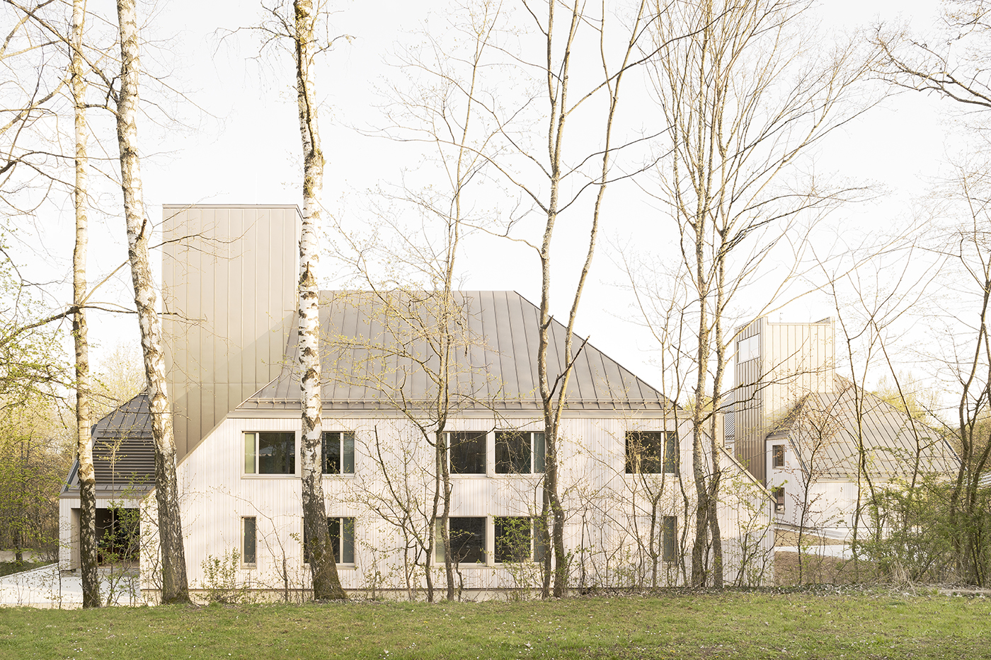 Auch hier verbildlicht sich die Bauaufgabe im Dach, wie Antje Freiesleben sagt: „Das schützende, weit auskragende Dach war für uns der Aufhänger: symbolisch als Schutz der Menschen im Haus, aber auch ganz praktisch zum Schutz der Holzkonstruktion und der Fassade.“ Denn das Gebäude ist eine Hybrid-Konstruktion, mit einem massiven Sockel und einer Holzkonstruktion darüber.