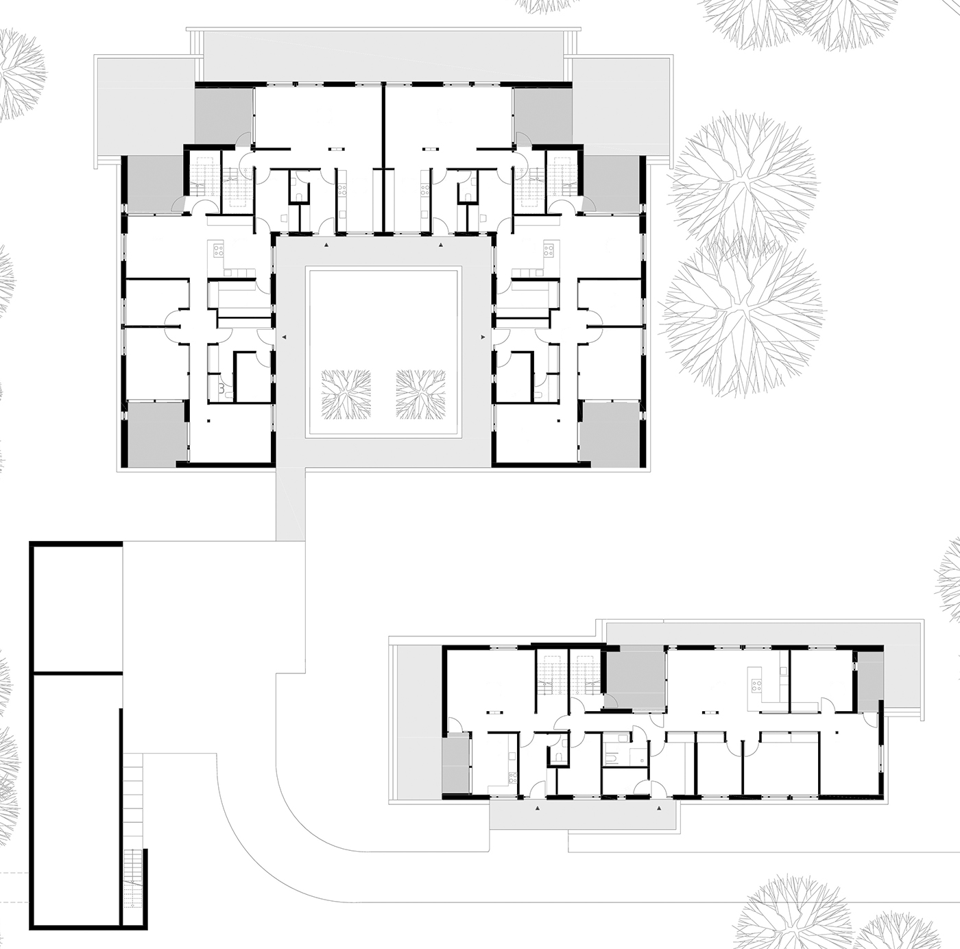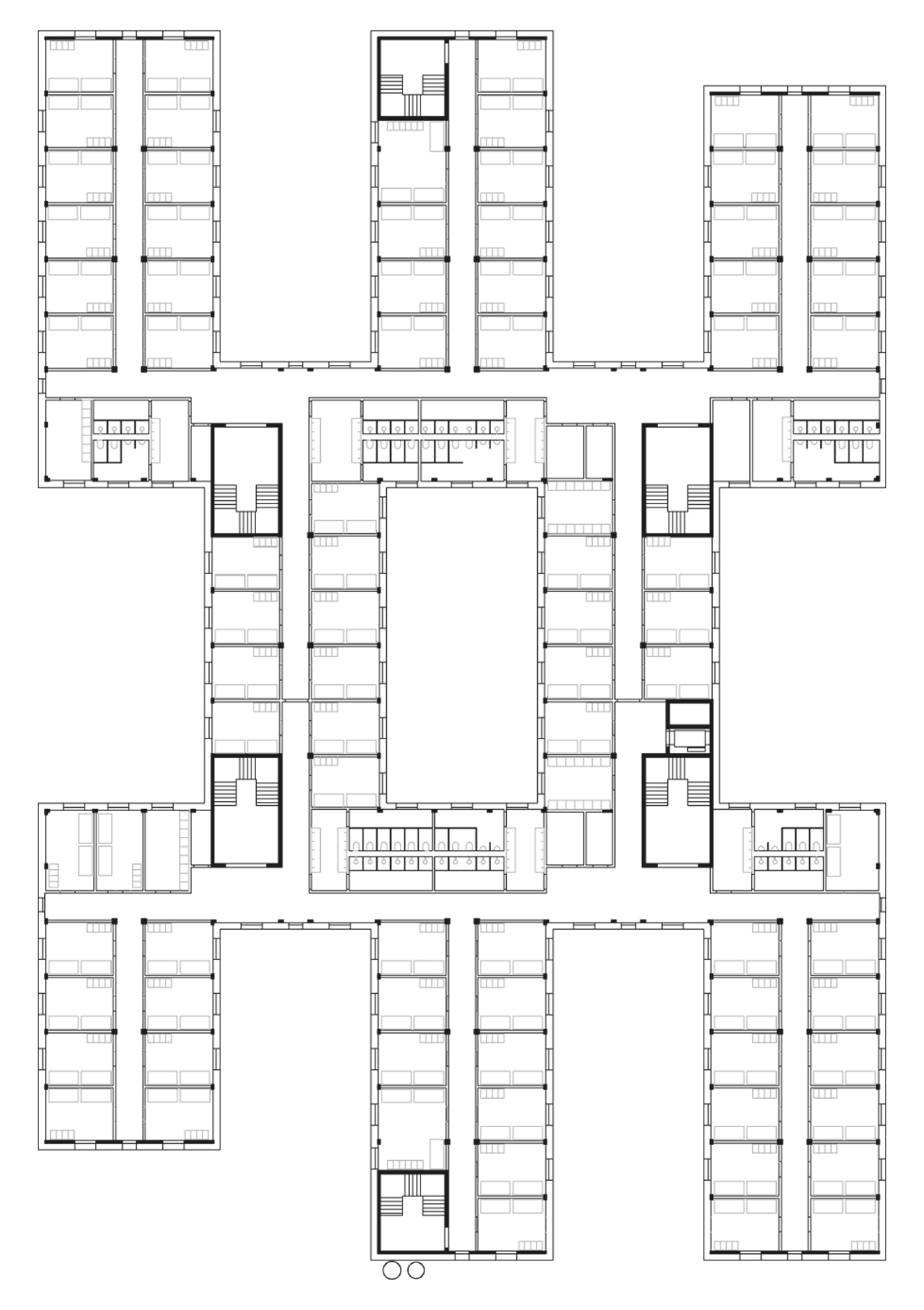 Eine Machbarkeitsstudie half, die geeignete räumliche Organisation und Typologie zu finden. Matthias Haber erläutert: „Für die Nutzenden sollte der Ablauf klar ablesbar sein, von der zentralen Aufnahme über den Verteilerhof bis zu den Wohntrakten.“ Die Kammstruktur entspricht dem Prozess im Innern und ermöglicht die einfache bauliche Trennung der Funktionen und Wohntrakte.