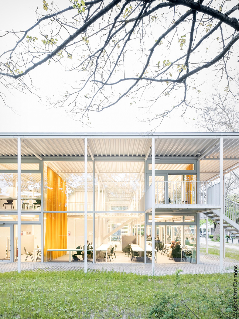 Das zweigeschossige, voll verglaste Gebäude ist um einen ausgesteiften Gebäudekern für Café und sanitäre Anlagen herum in Stahl-Holz-Hybridbauweise ausgeführt. Ein modulares Raster von drei mal drei Metern bildet die Grundlage, die konstruktiven Elemente bestehen aus quadratischen Stahlhohlprofilen mit zehn Zentimetern Querschnitt. Ebenso wie die Fassaden und die Deckenelemente wurden sie miteinander verschraubt, was die spätere Demontage und eine Neukonfiguration an anderer Stelle erlaubt.