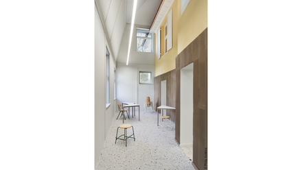 Hinzu kommen lisenenartige Vorsprünge auf den inneren Wand- und Dachflächen des neuen Gebäudeteils, die als Hinweis auf die Raumstruktur des Altbaus dienen. „Das Gebäude wurde in der Vergangenheit öfter mal saniert und umfasst deshalb auch Elemente, die nicht aus der Originalzeit stammen. Wir haben bewusst mit diesen unterschiedlichen Zeitschichten gearbeitet und sie 1 : 1 kopiert. Einerseits wollten wir dadurch den Bestand respektieren. Anderseits wird das Gebäude, das vor unserem Umbau ein alltägliches Bauobjekt war, durch subtile Überlagerungen plötzlich zu etwas Besonderem“, fasst Sarah Behrens das Konzept zusammen.