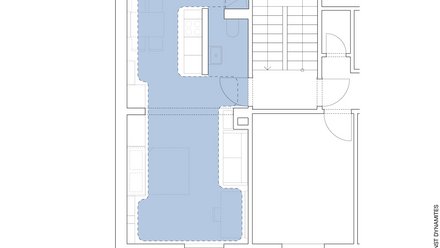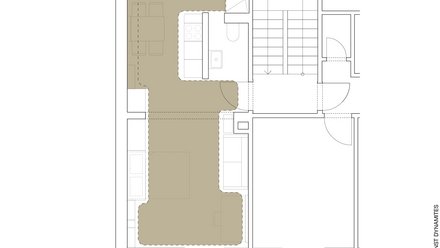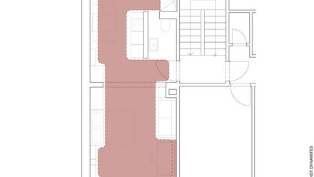 Ein weiteres Beispiel für den kollaborativen Ansatz des Büros ist das Projekt „Wohnen mit Morris“, bei dem The Baukunst Dynamites 2020 eine 36 Quadratmeter große Wohnung in Stuttgart sanierten. „An den Auftrag sind wir über unseren Bekanntenkreis gekommen. Zuerst klang die Aufgabe eher nach der klassischen Sanierung einer kleinen Mietwohnung. Als wir den Bauherrn dann näher kennenlernten, zeigte sich immer mehr, dass er sehr aufgeschlossen und experimentierfreudig war“, sagt Sarah Behrens über das Projekt. Das Ergebnis ist eine Einraumwohnung, in der Arbeiten, Wohnen, Kochen, Essen und Schlafen in einem flexiblen Raumgefüge zusammengefasst sind.