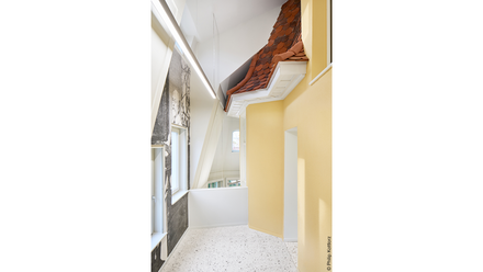 Dabei wird die damit einhergehende Überlagerung von Zeitschichten nicht nur durch die Geometrie der Gebäudeteile, sondern auch durch die Materialität und deren Textur erzeugt: Statt gelb verputzten Wänden und rötlichen Ziegeln weist der Anbau Betonziegel und eine grau-weiße Farbgebung auf. Im Innern treffen seine schwarz-weißen Terrazzofliesen auf die beige-braunen Terrazzofliesen des Bestands.