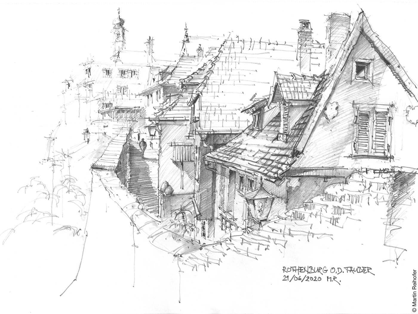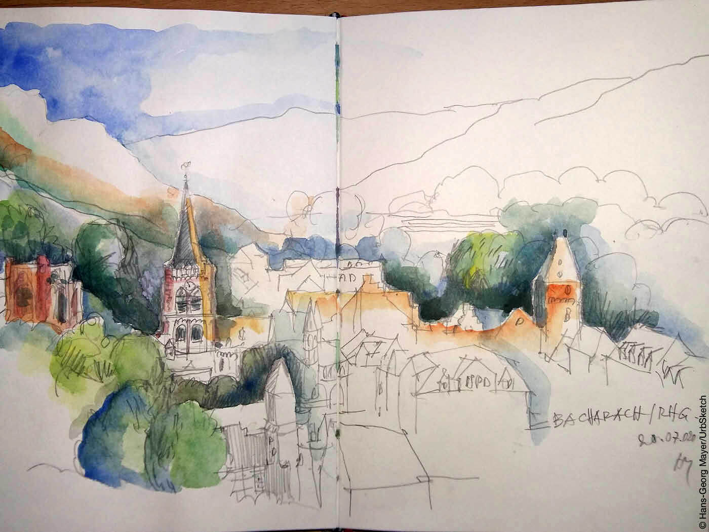 Auf meinen Tagestouren von Mai bis Oktober hatte ich stets Verpflegung und mein Skizzenbuch im Rucksack. Ich setzte mich nicht unter Zeitdruck und so waren alle Touren (jeweils circa 6 Stunden) die pure Entspannung. Meine Tagesstrecken von durchschnittlich 60 Kilometern führten durch Wald und Flur runter zum Rhein (ca. 400 Höhenmeter) bis St. Goar, Oberwesel, Bacharach und wieder hinauf nach Wiebelsheim. In den genannten Orten am Rhein entstanden dann auch die meisten Skizzen.