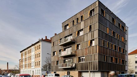 Die Fassade des Leipziger Wohnhauses Klinge10 (Architektur: ASUNA) beteht aus Schalhäuten und einfachen Holzlatten. Beides sind upgecycelte Baustellenmaterialien, die nicht für den sichtbaren Einsatz am Gebäude gedacht waren. © Peter Eichler