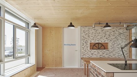 Das CRCLR House in Berlin wurde in und auf einer alten Brauerei-Lagerhalle errichtet. Im Erdgeschoss befindet sich ein Co-Working Space, dessen Innenausbau (Architektur: LXSY) zu rund 70 Prozent von Abriss-Baustellen, aus unverkäuflichen Lagerbeständen oder dem Holzverschnitt von Tischlereien stammt. © Studio Bowie