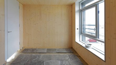 Im Obergeschoss des Recyclinghauses Hannover (Architektur: cityförster) ersetzen alte Gehwegplaten den Estrich. © cityförster
