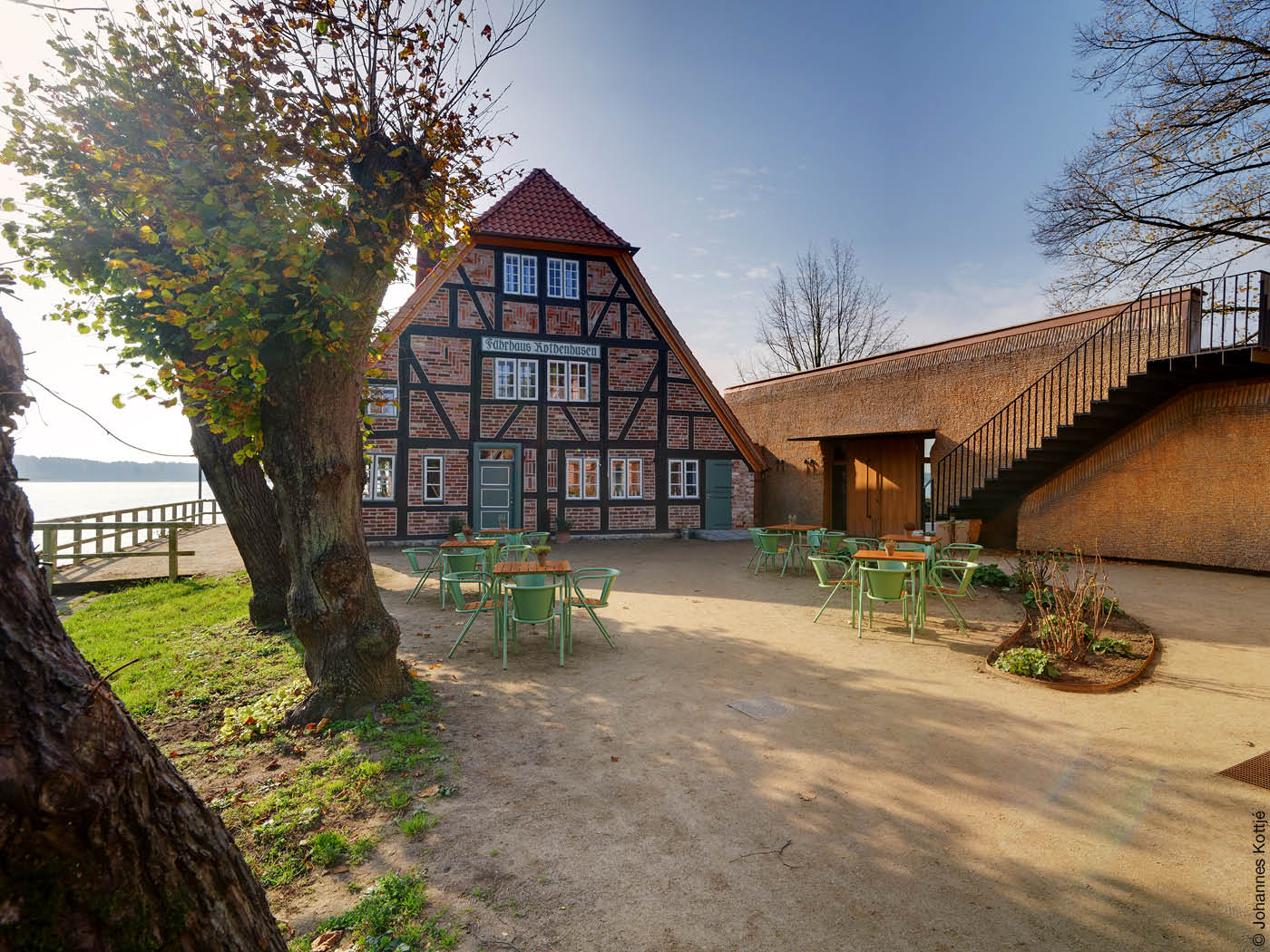 Mißfeldt Kraß Architekten aus Lübeck sanierten den sehr kleinen Fachwerkbau und erweiterten ihn seitlich um einen lang gestreckten, schmalen Neubau mit integrierter Küche zu einem besonderen Gastraum, dessen Außenwand vollständig mit Reet bekleidet ist. Zum See hin öffnet sich der neue Baukörper, der nur ganz knapp an den Altbau anschließt, vollständig mit einer raumhohen Verglasung. Davor befindet sich die Außengastronomie. Auch das Flachdach bietet Platz für Tische und Sitzplätze. Eine schlanke Stahl-Außentreppe führt hinauf. Das Reet umschließt den Baukörper auf dreieckigem, sich zum Altbau hin verjüngenden Grundriss an der Eingangs- und Rückseite und zeichnet die Ecken materialgerecht abgerundet nach. Dieser ungewöhnliche Einsatz des Reets führt eine optisch klare, zugleich aber weiche Trennung vom Altbau herbei.