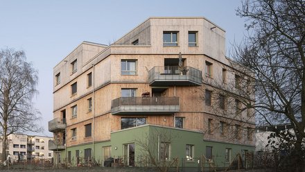 Der polygonale Baukörper ist das Ergebnis eines gemeinschaftlichen Planungsprozesses der Aachener Genossenschaft. © Viola Epler fotografie