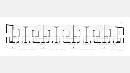 In den fünf Wohngeschossen und einem Staffelgeschoss sind 39 Wohneinheiten mit zwei bis vier Räumen untergebracht. Sie sind über Treppenhäuser und Aufzüge an den beiden Stirnseiten und über bis zu drei Meter tiefe verglaste Laubengänge an der Straßenseite erreichbar. „Tritt man aus einer Wohnung, steht man unmittelbar in den Baumkronen“, beschreibt der Architekt. Vor den Fenstern von Küchen und Bädern halten Lichtschächte die Laubengangnutzer auf Abstand und sichern Privatsphäre.