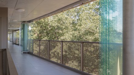 Die Glas-Faltwände schützen die Laubengänge vor Lärm und Witterung. © Till Schuster