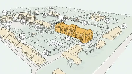 Auch ein flexibel nutz- und mietbarer Gemeinschaftsraum mit circa 200 Quadratmeter Fläche ist geplant. Er soll im charmant asymmetrischen und flachen Wirtschaftsgebäude entstehen, das in der Hauptachse der Anlage steht. Die Verortung dieses sozialen Treffpunkts im pittoresken und zurückhaltenden Haus an überraschend zentraler Stelle der ehemaligen Kaserne ist geradezu ein Sinnbild für die neue Gemeinschaftlichkeit, die in dem kleinen Quartier wachsen soll – und die mit der jahrzehntelangen militärischen Gruppenformierung, die an diesem Ort stattgefunden hat, programmatisch bricht.
