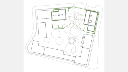 Die Kita im Modellquartier Ellener Hof ist auf zwei Gebäude verteilt (grün umrandet), damit die alten Bäume dazwischen stehen bleiben konnten. © ZRS Architekten Ingenieure