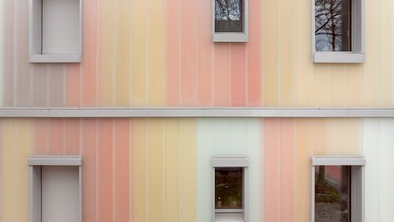 Wer die Straße entlanggeht, sieht erst mal nur recht neutrales Milchglas – die Lärm, Schmutz und Vandalismus abwehrende, aus industriellem Profilglas gefertigte Fassade des Projekts, die rückgebaut werden kann. Dahinter aber verbirgt sich eine bunt gefärbte Dämmung, ein Kaleidoskop der im Viertel vorgefundenen Hausfarben, das erst erstrahlt, wenn der Betrachter direkt vor dem Haus steht. Ebenso eigen wie die „ortsübliche Farbgebung“ interpretierten die Planer eine weitere Vorgabe der Behörden: Ein „Satteldach“ hat das Haus nur in Form aufgeständerter PV-Module.