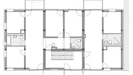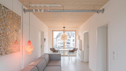 Zweitens zwackten die Planer in den Grundrissen wirklich jeden unnötigen Quadratmeter ab: Die meisten der momentan neun Wohnungen kommen ohne Flur aus. Bodentiefe Fenster und vorgehängte Balkone weiten die schmal geschnittenen Zimmer. Über 27,8 Quadratmeter verfügt jede Person im Durchschnitt, 20 weniger als im Bundesschnitt. Und auch als Ganzes holt das nur gut neun Meter tiefe Haus mit einer Geschossflächenzahl von 2,38 aus der Situation alles heraus.