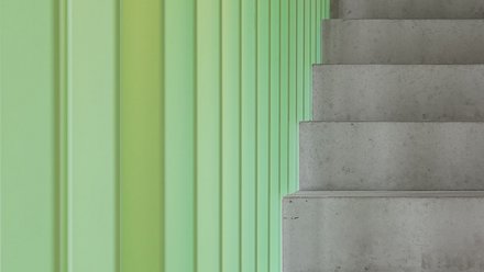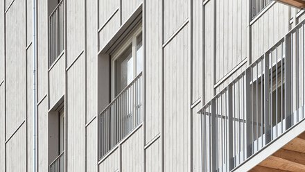 So ist das zentrale Treppenhaus in Massivholz ausgeführt worden, allein der Treppenlauf ist aus Beton. Selbst die Balkone bestehen aus Holz. Sämtliche sichtbaren Holzbauteile sind „auf Abbrand“ dimensioniert, wirken aber dennoch nicht schwer. In der aus vorvergrauter Fichte im Nut- und Feder-System geformten Fassade dienen gegeneinander versetzte Holzleisten und Stahlbleche zwischen den Etagen als Brandsperren.