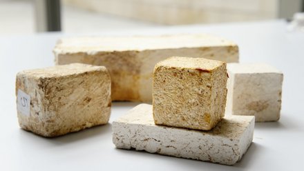 Diese Verwebungen werden so stark, dass daraus feste Steine und Platten hergestellt werden können. Dazu wird das Myzel aus der Tüte in eine „Backform“ umgesetzt. Hat es die Form komplett ausgefüllt, wird es im Ofen erhitzt, damit das Wachstum aufhört und der Pilz stirbt. Dirk Hebel: „Was bleibt, sind Strukturen, die an Knochenmasse erinnern.“