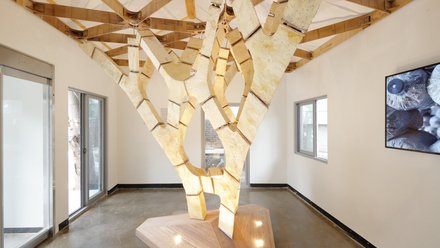 Auf der Biennale of Architecture and Urbanism in Seoul setzten Dirk Hebels Studierende zusammen mit der Block Research Group der ETH Zürich schon 2017 eine tragende Konstruktion aus dem Pilzmaterial um. Der sogenannte Myco-Tree veranschaulicht, dass biologisch abbaubare Materialien die gleichfalls boomende Leichtbautechnik unterstützen.