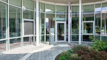Die Fassade sowie die Fenster und Türen wurden mit Systemen von Heroal realisiert. Als entscheidendes Auswahlkriterium erwies sich hierbei vor allem die mögliche Kombination der Systeme, die zugleich hohe sicherheitstechnische Anforderungen erfüllen. So ließ sich die Pfosten-Riegel-Konstruktion des Systems „C 50“ an die Rundungen des Grundrisses anpassen und die Fenster (System „W 72“) und Türen (System „D 65“ und „D 72“) ließen sich optimal in die Fassade integrieren.