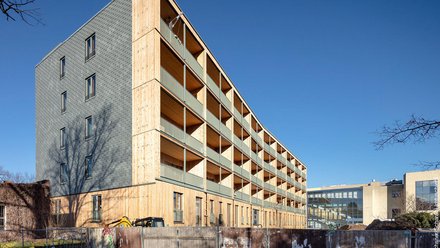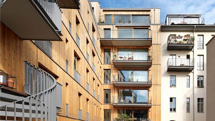 Warum mit Holz nicht einfach mal in der Stadt bauen? Das fragten sich die Berliner Architekten Susanne und Farid Scharabi, als sie sich erste Gedanken um die Planung ihres schon 2009 fertiggestellten siebengeschossigen Wohn- und Geschäftshauses „Wohnen an der Barnimkante“ machten. Der Neubau im Stadtteil Prenzlauer Berg zählt zu den Pionierprojekten des mehrgeschossigen Holzbaus in der Stadt.